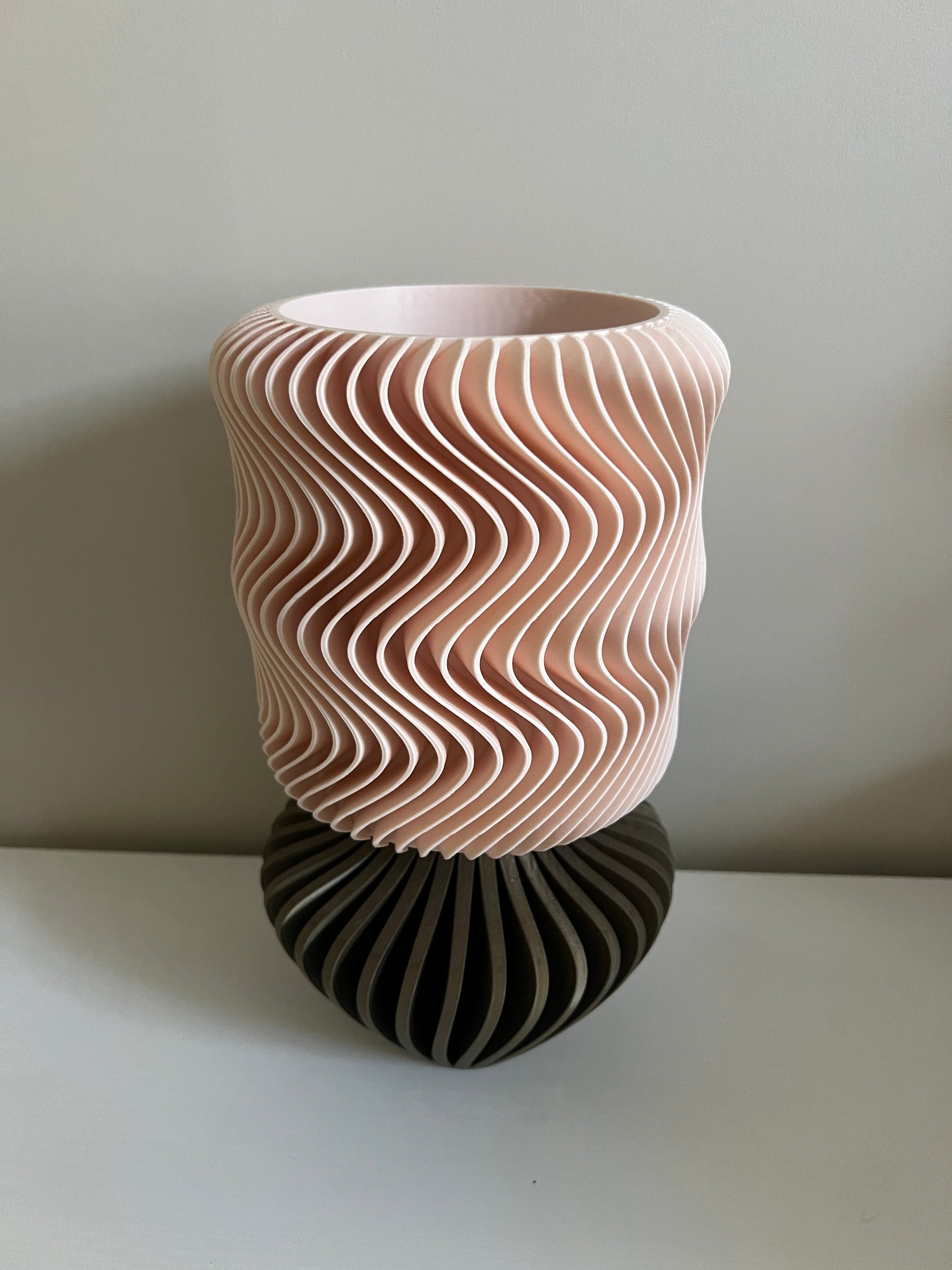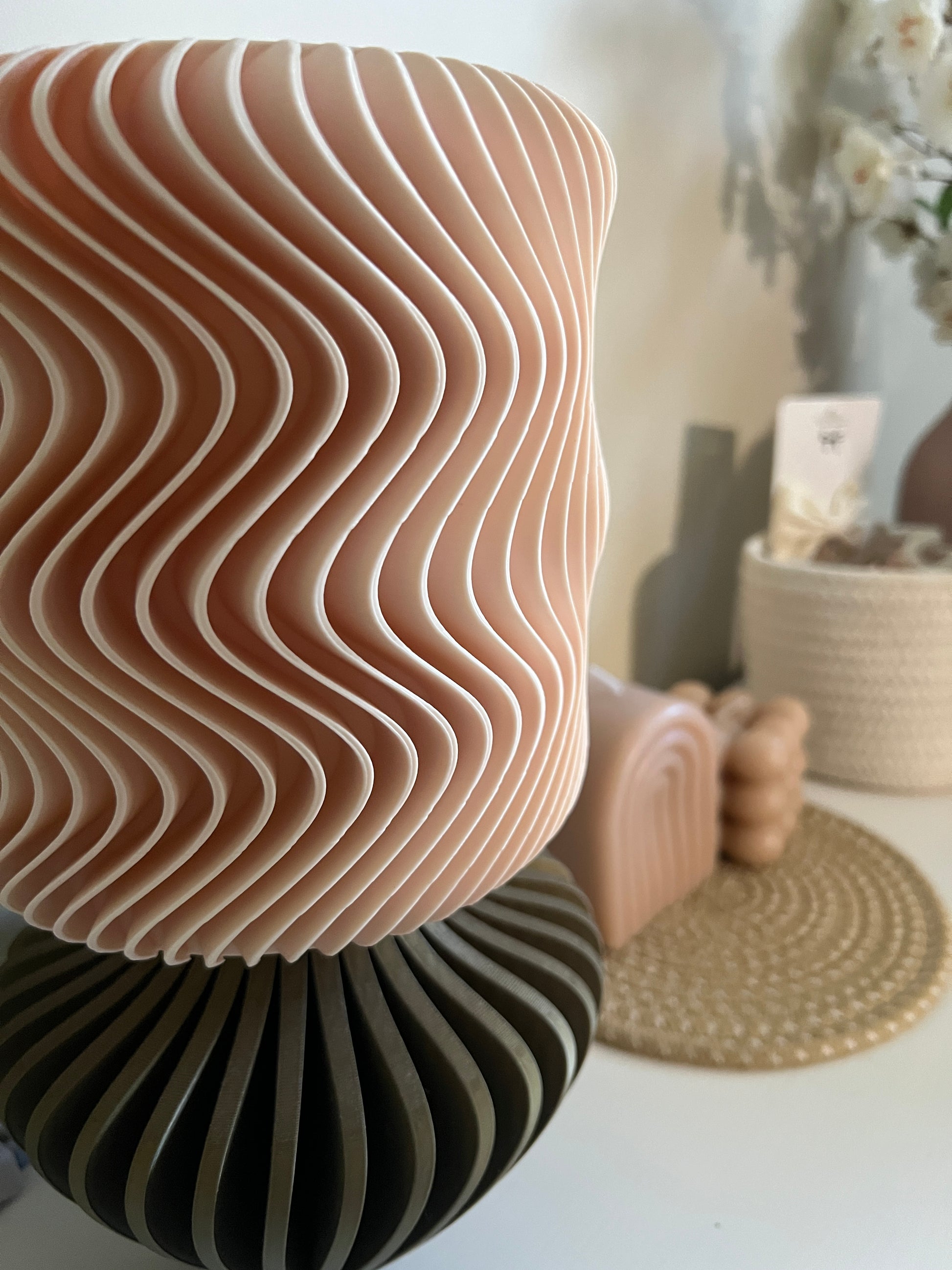 Pārveido savu telpu ar šo unikālo 3D drukāto lampu, kas apvieno modernu dizainu un mājīgu noskaņu. Viļņotais raksts rada elegantu gaismas un ēnu spēli, kas piešķir interjeram māksliniecisku un siltu akcentu.